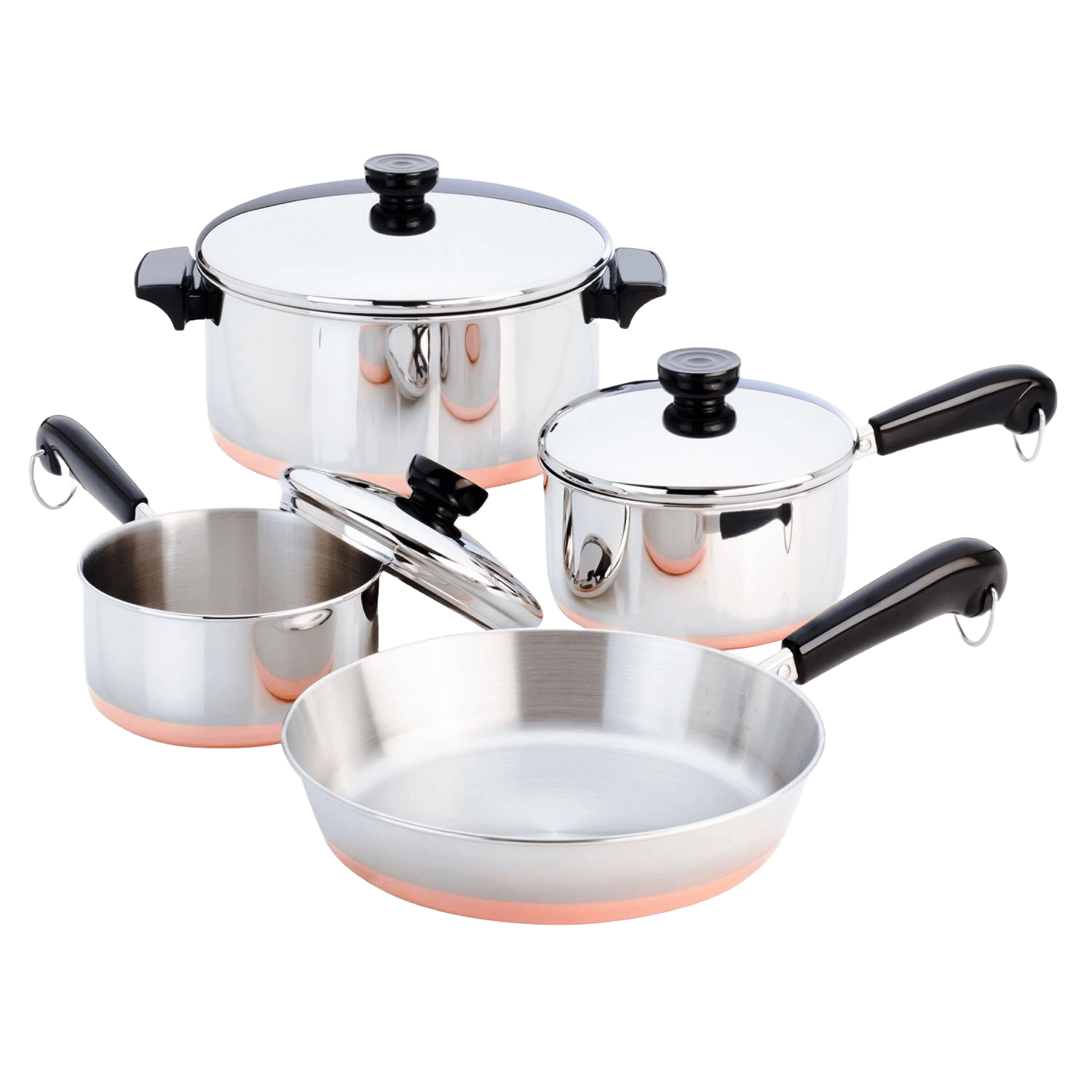 Revere Ware is primarily made of stainless steel, with many pieces featuring a copper-clad bottom for improved heat conductivity. Some older models also have aluminum cores for better heat distribution.